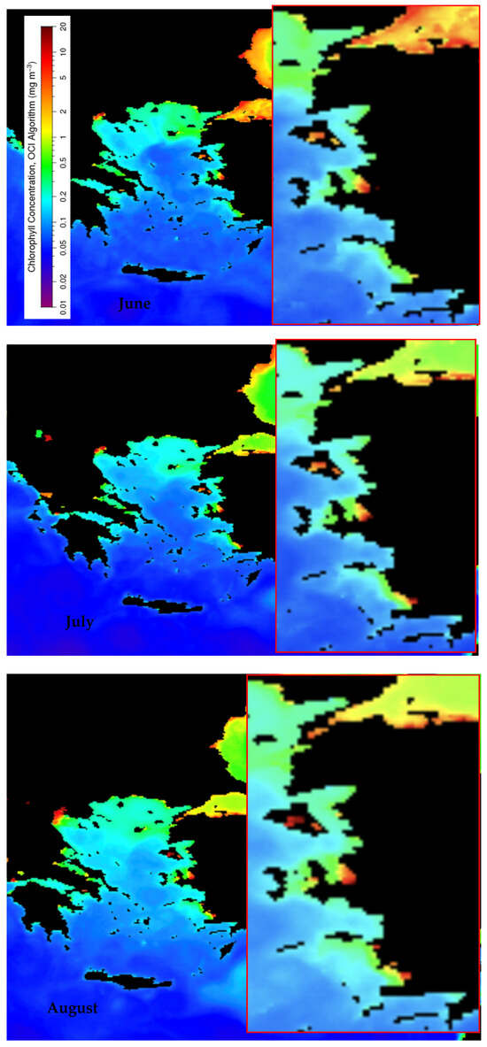 Monthly averaged surface chlorophyll distribution in a resolution of 4 × 4 km for June, July, and August 2024 along the coast of the study area (the maps were provided by Prof. Dr. Ahmet Cemal Saydam from https://oceandata.sci.gsfc.nasa.gov/ (accessed on 10 May 2025)).
