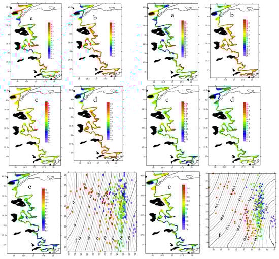 Sea surface (left panel) and near-bottom (right panel) water temperature in °C (a), salinity in ppt (b), pH (c), dissolved oxygen in mg/l (d), total suspended matter in mg/l (e) and T-S diagram with isoclines of density, σt at the stations colored with geographical latitudes (f) (see Figure S1 for the station locations) (from [61]).