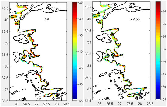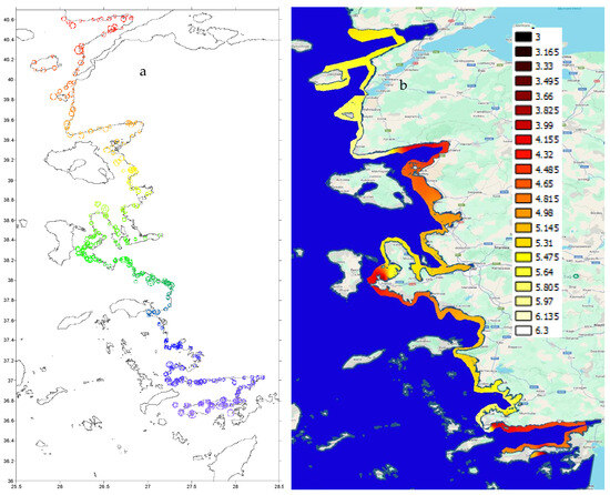 The maximum Secchi disk depth was recorded as 31.5 m near the Gelibolu Peninsula. In general, this depth increases from the coast toward the open sea. In some specific areas, especially near fish farms, the Secchi disk depth was measured to be low (Figure 5). Additionally, low depths were observed in regions dominated by Black Sea water. The minimum Secchi disk depth was 3 m at station P93, followed by 4 m at station P219 (Figure 5 and Figure S1).