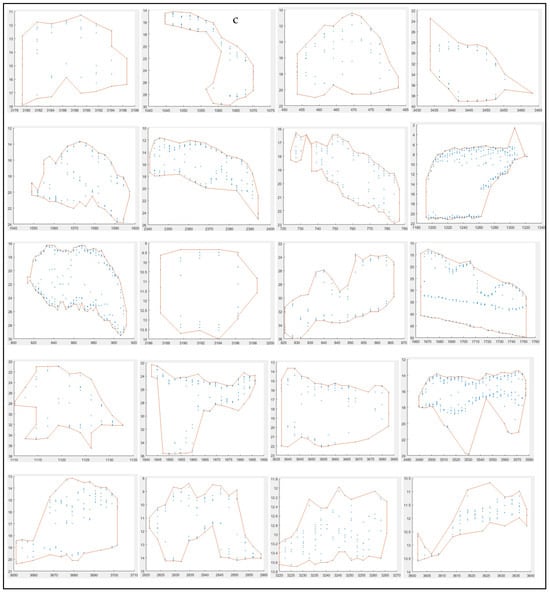 An example echogram in bottom depth in m vs yearday in the format of Julian day. time of hours + min + sec of day (a) with the bottom line (red) and automatic school detection (b) in the corresponding echogram from the beginning in progress, and a variety of school shapes (c) throughout the entire study area from south to north. Each school shape was formed in the direction from left to right, headed by the ship, and in 2-D of depth (in m on Y-axis) vs horizontal distance (in m on X-axis) converted from the geographical coordinates.