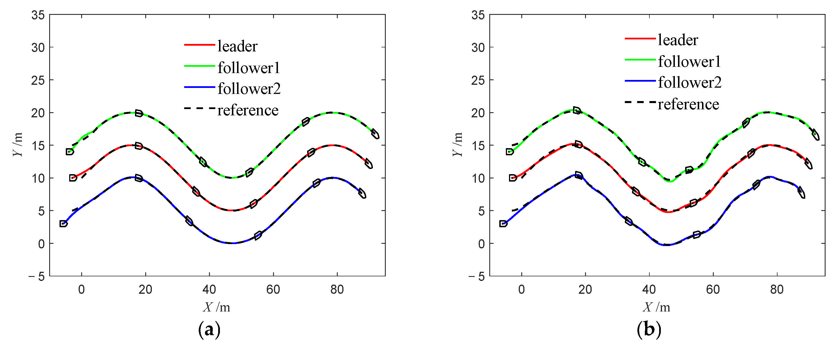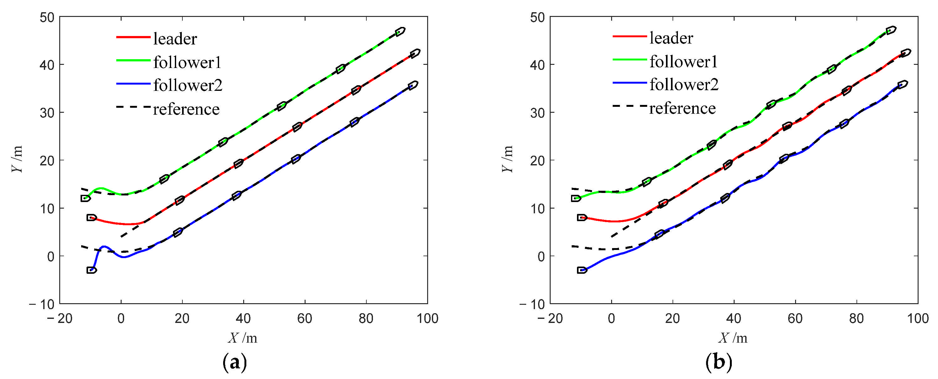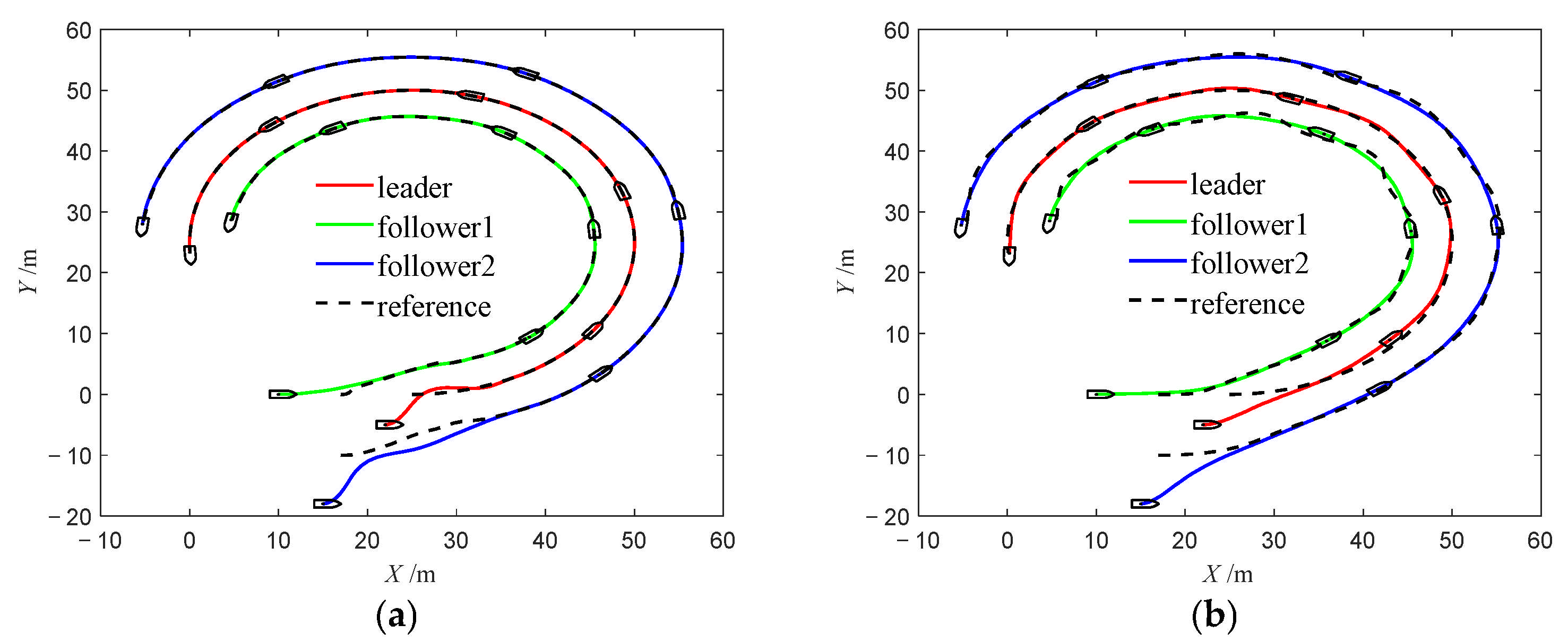 Figure 28b illustrate the trajectories under Method 2. Compared with Method 1, the USV formation under Method 2 fails to follow the desired trajectory as closely and exhibits more pronounced tracking errors, highlighting the limitations of the PID algorithm in USV tracking control.