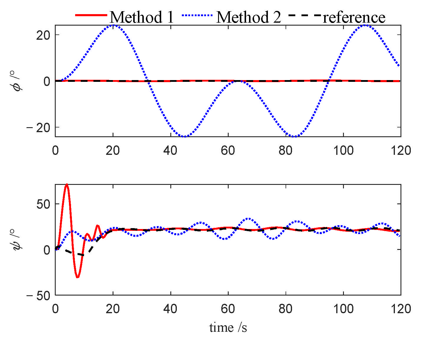 Figure 32 depict the variations in roll and heading angles for the leader USV and two follower USVs across three different cases. It can be observed that, under Method 2, significant periodic errors are present in the roll and heading angles of all three USVs, indicating a lack of convergence in these states when the PID algorithm is applied. In contrast, under Method 1, both the roll and heading angles are accurately tracked to their desired values, further validating that the NMPC algorithm, designed based on the quasi-infinite horizon theory, ensures superior stability and performance compared to the PID algorithm.