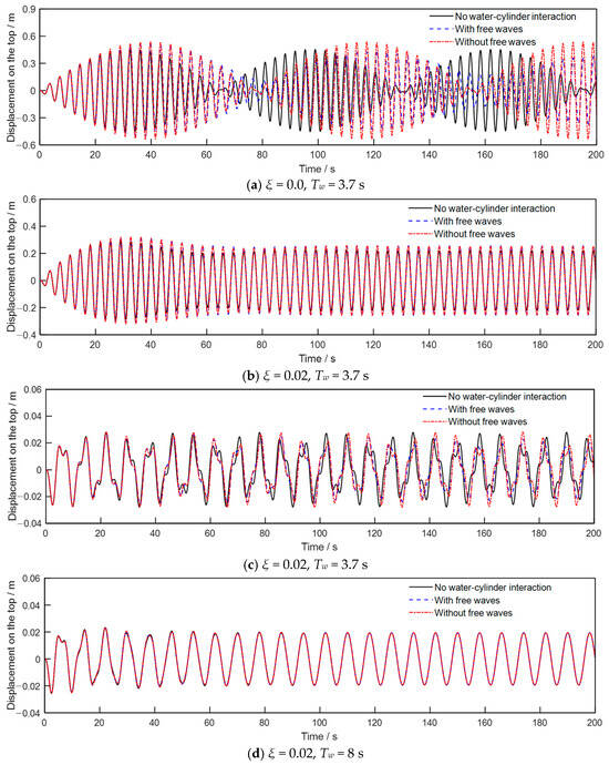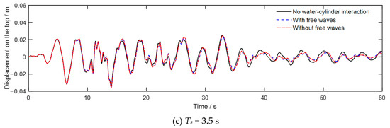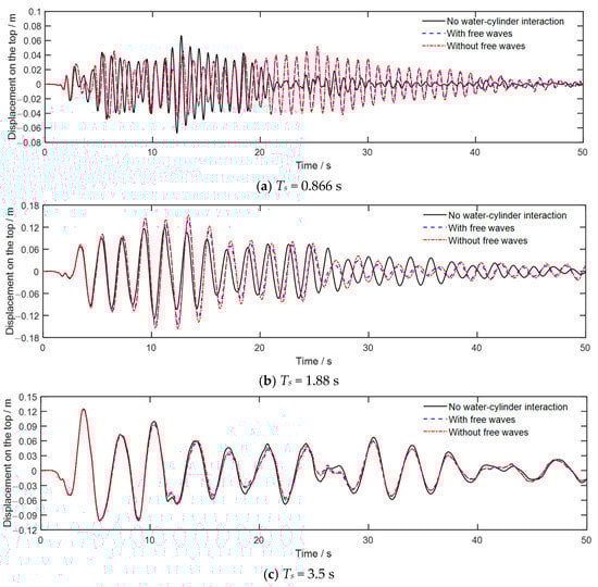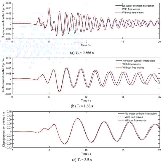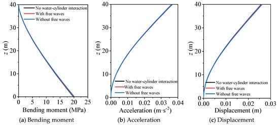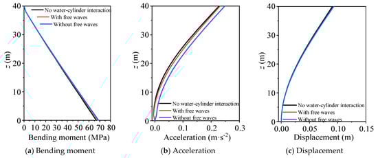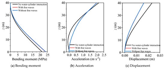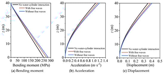 - Water–cylinder interaction generally increases the displacement and bending moment of the cylinder under wave loads, while it can markedly decrease the dynamic responses when the wave period is close to the natural vibration period. The effects of water–cylinder interaction can be neglected for wave periods greater than 5 s.