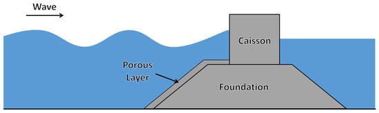 Sea level has been rising year by year due to global climate warming, leading to more violent storm events [,]. Consequently, the coastal structure protection faces increasingly severe challenges. Breakwater is an essential structure designed to protect coastlines from wave action. According to its structural configuration, traditional breakwaters can be categorized as vertical breakwaters, rubble mound breakwaters, or composite breakwaters []. Composite breakwater can be regarded as a combination of the former two types, typically comprising a concrete caisson, a rubble mound foundation, and a porous layer [], as shown in Figure 1. Composite breakwaters combine wave-energy dissipation with wave-reflection capabilities and are frequently employed in harsh wave environments to protect against wave attack []. However, wave impacts can compromise the stability of the breakwater, potentially leading to failure. Typically, three modes of failure are observed: the sliding or inclining of caisson, and scouring of the foundation or layer [].