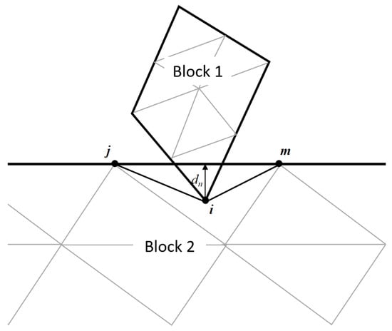 Notably, the penalty method is used to enforce contact constraints. By considering the contact of two blocks 1 and 2, the penetration distance of point i into element edge of block 2, as shown in Figure 2, can be calculated as follows [,]: