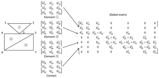To obtain each submatrix, we first compute the total potential energy of each element and then minimize it, yielding the corresponding equation for each element. Subsequently, based on the nodes connectivity, each element’s submatrix and load contributions is assembled into the appropriate entries of the global equation, as shown in Figure 3.