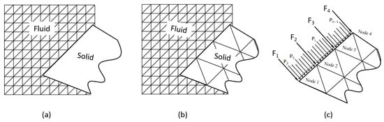 The fluid-solid coupling requires a transfer from pressure in fluid domain to external force in solid part. When coupling CFD with DDA method, the fluid pressure can only be applied to the two end nodes of the solid [,], which is shown by Figure 4a. In this study, the fluid and solid domains are both meshed. Therefore, the nodal pressure forces of the fluid (, ) are converted into equivalent nodal forces and of the nearest nodes of the solid, as shown in Figure 4b,c. To illustrate, the external fluid nodal forces and on solid nodes 1 and 2 are determined by Equation (31).