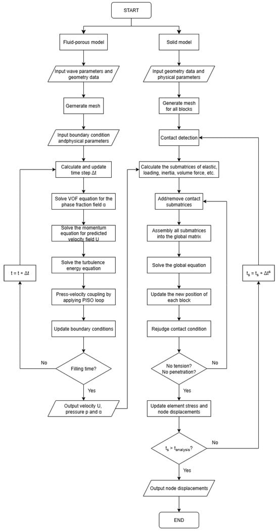 To describe the operation process of the coupled fluid-porous-solid model, a flowchart is created as shown in Figure 5, with the details of boundary conditions, inputs, outputs and connection of each model. The numerical simulations for the fluid-porous model are performed using the OpenFOAM platform, employing the Olaflow solver to solve the coupled equations of the fluid and porous medium. The mesh generation is also performed within OpenFOAM using BlockMesh tools. Regarding the simulation of solid displacement, we have developed a home-made NDDA numerical model which considers the displacements of the nodes of the finite elements, unlike classical DDA which considers the displacements of blocks.