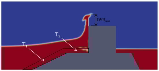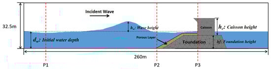 In order to analyze the influence of the porosity and the thickness of porous layer, the maximum impacting wave height () and the turbulent kinetic energy (TKE) are tested with four different porosity values (0.35, 0.417, 0.49 and 0.6). is the maximum elevation which the wave run-up exceeds the caisson crest following wave impact. The porous layer thickness is defined in two segments: on the seaward-facing slope, and on the slope platform in front of the caisson, as shown in Figure 11.