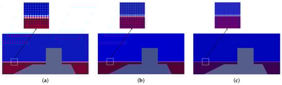 In the model, in addition to the solid-fluid two-phase elements within the porous medium, there are also air-fluid two-phase elements at the free surface of the seawater, as well as pure air elements and pure fluid elements. As mentioned in Equations (3) and (10), is used to represent the fluid volume fraction and its value ranges from 0 to 1. When = 1, the element is full of fluid and = 0 corresponds to full of air. In order to calculate inside each computational cell, the transport equation of Volume-of-Fluid (VOF) method is employed as follow []: