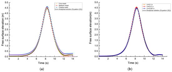 Free surface elevation of mesh and time step sensitivity: Comparison between computed solution and analytical solution (Equation (32)): (a) Mesh sensitivity; (b) Time step sensitivity.