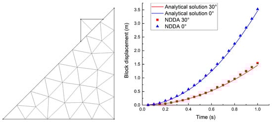In the validation test, an isosceles right-triangle block with leg length 2 m was positioned at the top of an isosceles right-triangle slope of leg length 10 m. Tests were carried out at friction angles of 0° and 30°. The simulation results were evaluated against analytical solutions using the RMSE. In both cases, the simulated displacements exhibited good agreement with the theoretical solutions, although the numerical results were consistently slightly larger than the analytical predictions, as shown in Figure 9 and Table 3.
