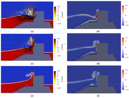 Flow patterns around the composite breakwater: figures (a,c,e) for velocity fields; figures (b,d,f) for corresponding vorticity map.
