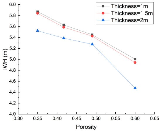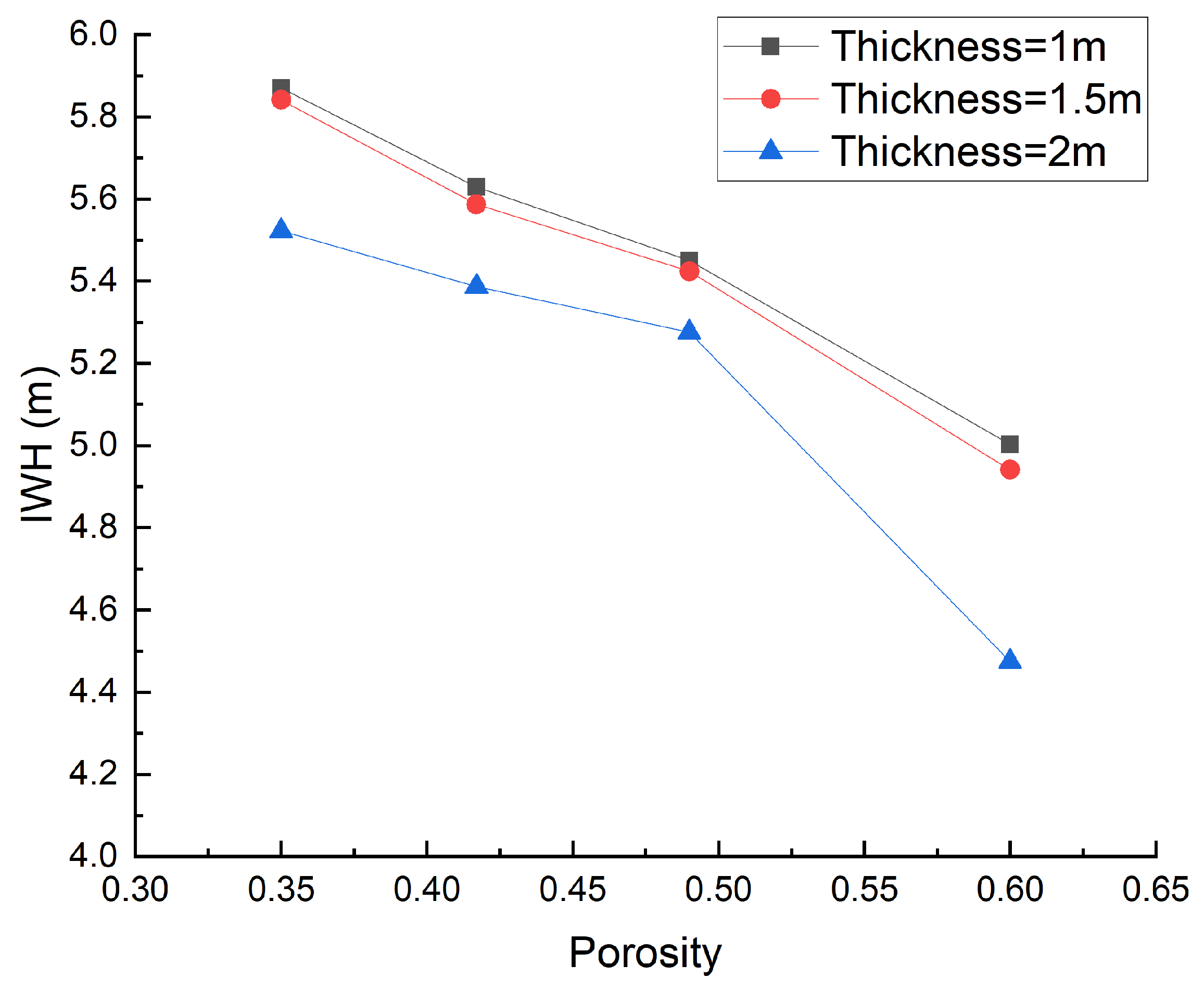 - The porosity and thickness of the porous layer both significantly influence maximum impacting wave height (). Higher porosity leads to a lower .