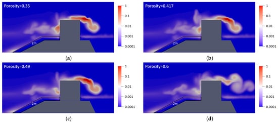 Based on these simulation results, as the porosity increases, the decreases significantly, as shown in Figure 12 and Table 4, and lower turbulent kinetic energy generates due to a large dissipation, which also means less effects of the waves on breakwater, as shown in Figure 13. The effect can be attributed to higher porosity, which expands the porous layer’s total pore volume in the porous layer, thereby allowing more fluid to be stored and thus absorbing a greater portion of wave energy before it reaches the caisson.