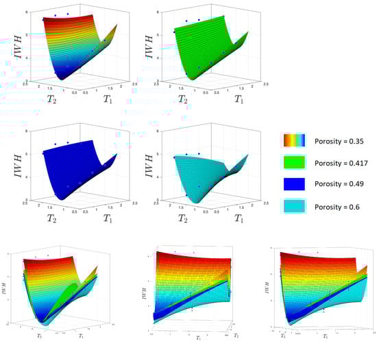 with various porosity, T1 = 1 m, 1.5 m and 2 m, T2 = 2 m.
