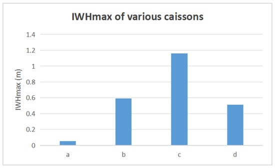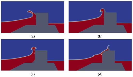 The simulation results of the seawater flow patterns for shaped caissons are shown in Figure 16. Under wave attack, Type a shows an overturning tendency caused by impact forces on its crown. Type b, similar to standard caissons, tends to undergo sliding. In contrast, Type d demonstrates greater stability, attributable to an increased area and duration of wave-structure interaction. In fact, when the wave strikes the structure, it follows the curved profile on the seaward side of the caisson, which reduces the impact force on the caisson and thus minimizes the risk of its sliding. This hybrid design also helps to dissipate the kinetic energy of the wave, thereby reducing the maximum Impacting Wave Height () thanks to the crest located above the caisson.