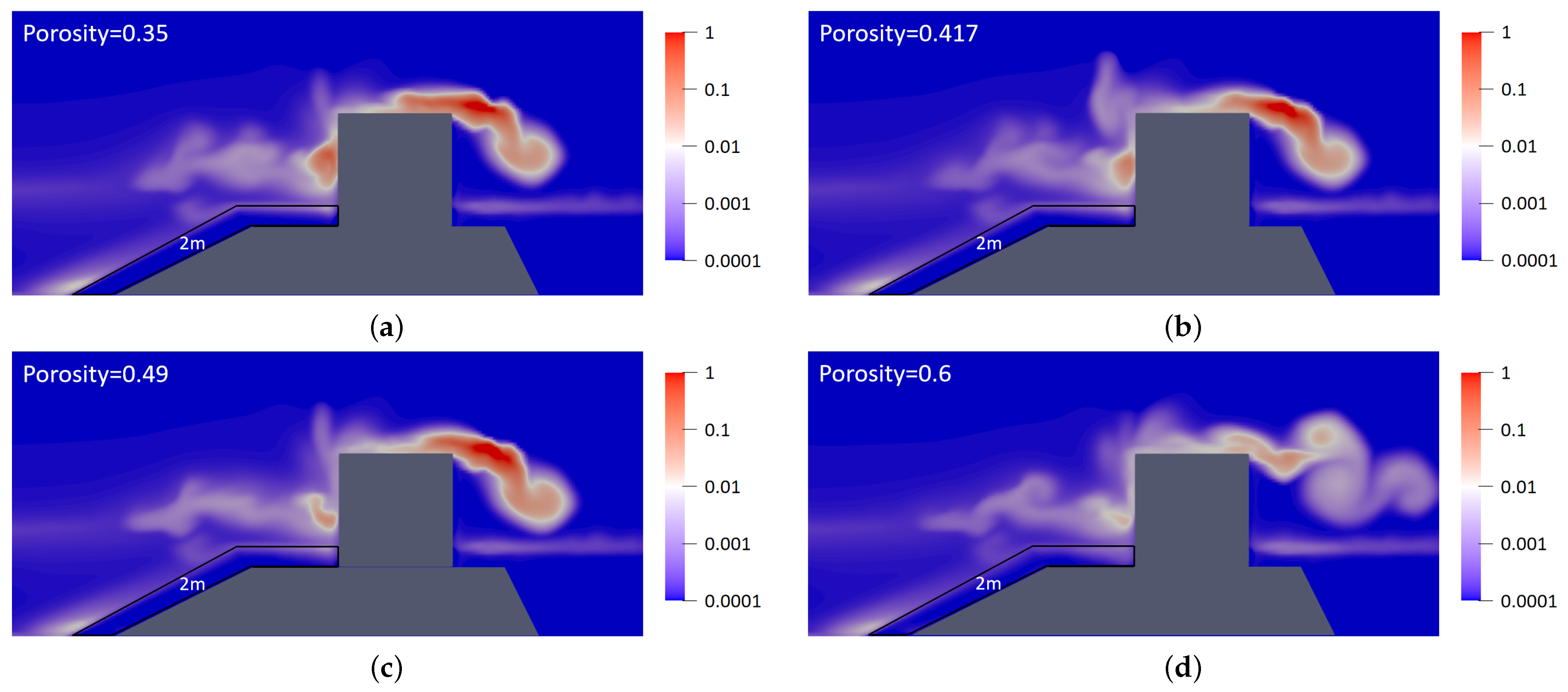- The porosity of the porous layer has a significant effect on the spatial distribution of turbulent kinetic energy (TKE). Higher porosity enhances the layer’s capacity to absorb and dissipate TKE, leading to a lower TKE intensity.
