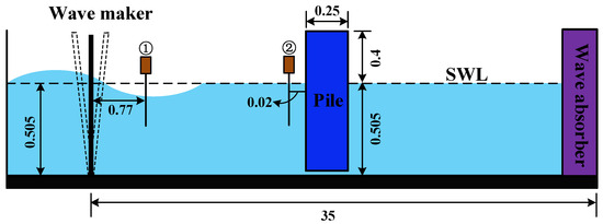 Schematic diagram of the flume experimental setup for wave-monopile interaction conducted by Zang et al. [21] (① and ② denote wave gauges).