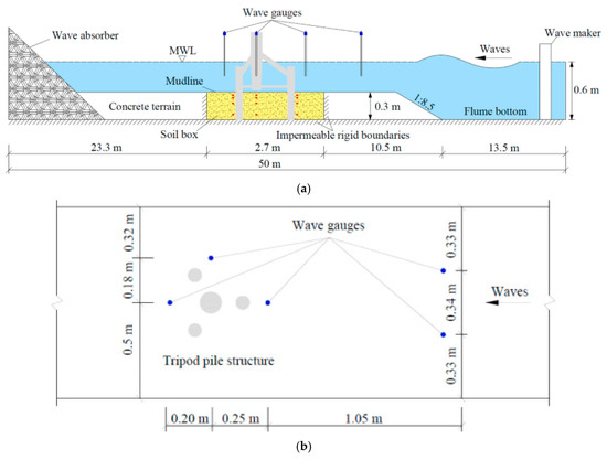 Experimental setup in Liu et al. [3] (a) wave flume; (b) location of wave gauges.