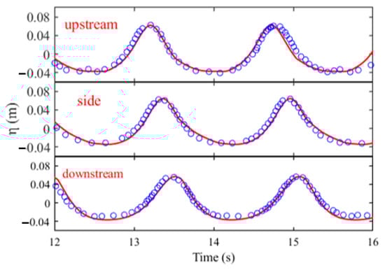 To further validate the OlaFlow model, the numerical results were compared with the experimental results by Liu et al. [3]. Liu et al. [3] conducted a study of wave dynamics for a tripod pile foundation in a flume with dimensions of 50 m length, 1 m width, and 1.5 m height at Hohai University. The basic setup of the flume test, the location of the tripod pile foundation, and the wave monitoring points are shown in Figure 4a,b, respectively. Figure 5 shows that the numerical results are in good agreement with experimental measurements, which further confirms the reliability of OlaFlow and supports its use in subsequent numerical investigations of jacket foundations.