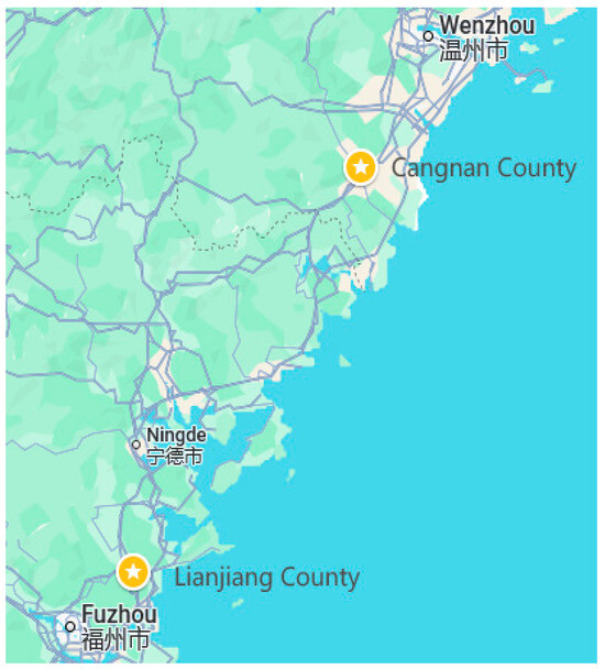 To advance offshore wind energy exploitation in southeastern China, deep-sea wind farm construction projects have been initiated in the adjacent waters of Cangnan County in Zhejiang Province and Lianjiang County in Fujian Province, China. The Locations of Cangnan County and Lianjiang County are shown in Figure 7. Taking the Lianjiang offshore wind farm as an example, a total of 39 wind turbines have been installed, with a combined capacity of 700 MW. Due to its location in deep-sea waters, 32 of the 39 turbines adopt jacket foundations as support structures to ensure the safety and reliability of the superstructure.