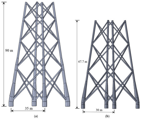 Schematic diagrams of the geometric models for the two jacket foundations (a) Jacket foundation in Cangnan offshore wind farms; (b) Jacket foundation in Lianjiang offshore wind farms.