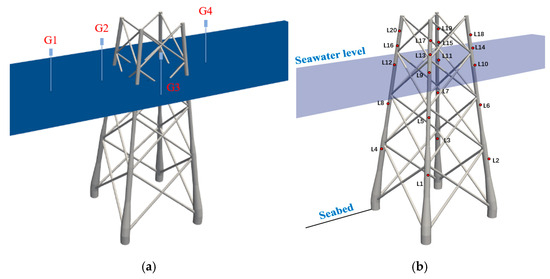 To monitor the wave evolution process before and after impacting the jacket, four wave elevation probes were established near the jacket structure, as illustrated in Figure 9a. Monitoring probes G1, G2, and G4 are positioned along the y-direction centerline, with G1 located at a greater distance from the jacket. Probe G3 is situated laterally adjacent to the jacket. Exact coordinates relative to the jacket center are provided in Table 3. Additionally, twenty pressure monitoring sensors were deployed on the jacket structure (Figure 9b) to capture wave impact characteristics at critical locations under various wave conditions. The spatial coordinates of these sensors for the Cangnan wind turbine jacket foundation under operating wave conditions are detailed in Table 4.