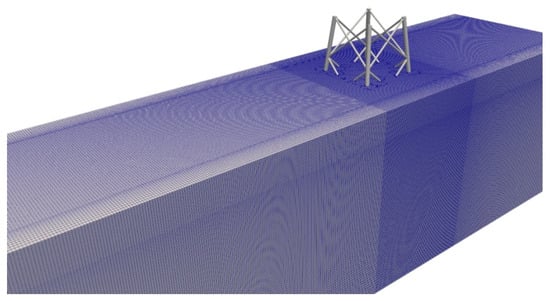 To ensure reliability in wave-structure hydrodynamic computations, local mesh refinement was implemented around the jacket foundations. For conciseness, only the fluid domain mesh near the Cangnan jacket under operational conditions is shown in Figure 10. The number of grid cells and the minimum size for each case in this study are shown in Table 5. Among them, the extreme wave condition mesh for the Cangnan jacket foundation peaked at 62 million cells. Prior tests had been conducted with varying mesh sizes. The final selection of the mesh dimensions and cell counts presented in this study was determined through a balanced consideration of computational efficiency and result convergence, specifically tailored for the case studies on jackets in different locations.