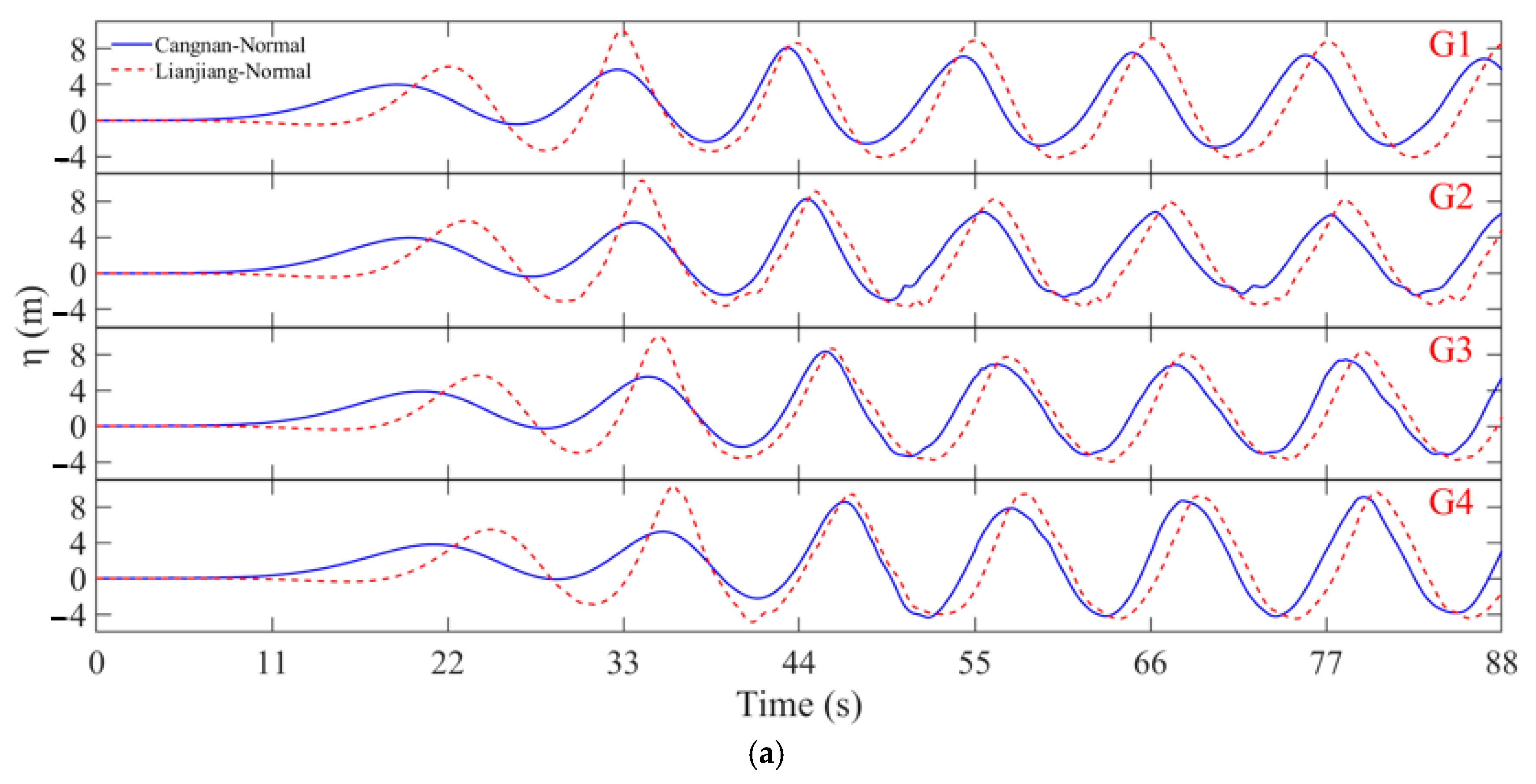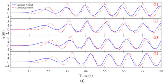 Figure 11 presents the simulated time series of wave profile evolution near the jacket foundations at the Cangnan and Lianjiang offshore wind farms. Under operating conditions, the wave profiles at monitoring points G1 (far upstream) and G3 (lateral to the structure) exhibit minimal variation for all jackets. In contrast, at G2—immediately upstream of the jackets—progressive wave crest steepening is evident, resulting from constructive interference and localized wave reflection. At G4, diffraction effects dominate the wave field due to the relatively small diameter of the structural members compared to the incident wavelengths, leading to localized wave height amplification behind the jackets through energy redistribution around the structure.