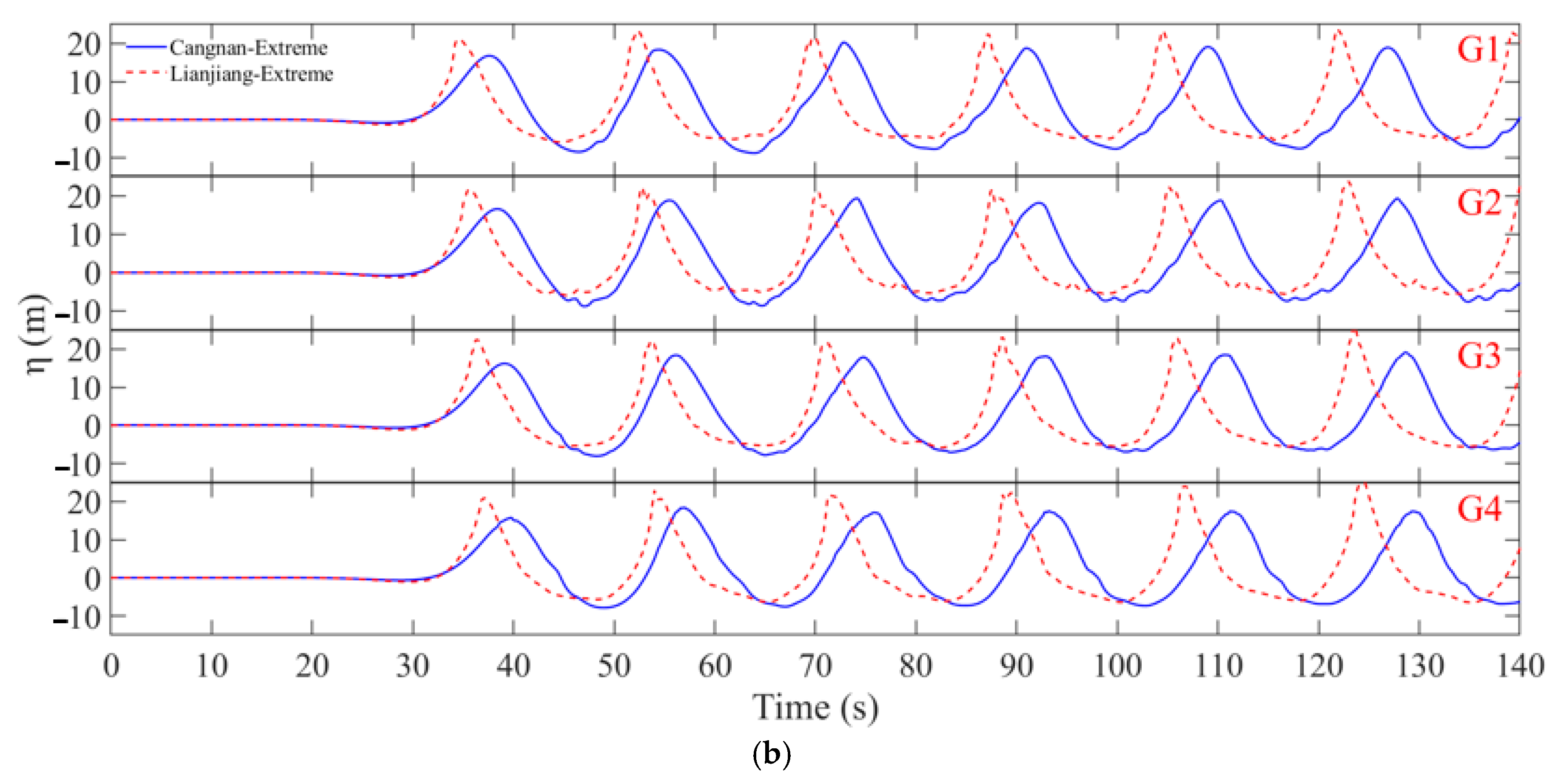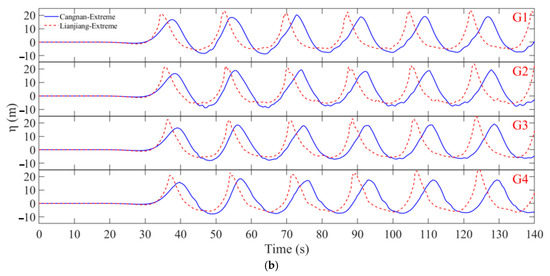 Under extreme wave conditions, pronounced crest steepening is primarily observed at G2 in the Cangnan case, highlighting intensified wave-structure interactions. In contrast, the Lianjiang case exhibits notable crest attenuation at G2, G3, and G4, which suggests significant wave profile distortion caused by highly nonlinear phenomena, including wave impact, breaking, and reflection.