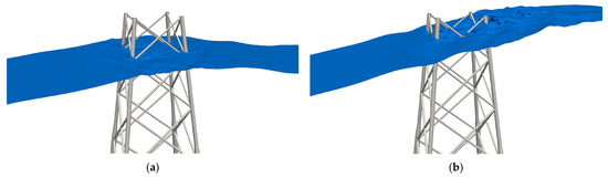 Representative wave run-up patterns on the Cangnan jacket under both operating and extreme wave conditions are illustrated in Figure 12. In this study, wave run-up is quantified as the maximum vertical excursion of the water surface above the still water level (SWL), consistent with standard hydrodynamic definitions.