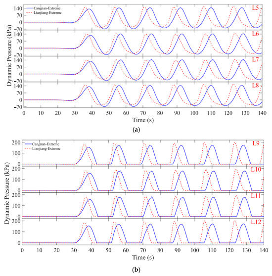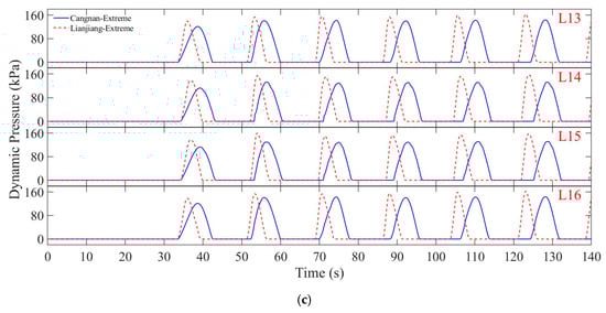 As wave impacts near the top and base of the jacket are relatively limited, Figure 13 presents the dynamic wave pressure time histories (excluding hydrostatic pressure) at three vertical sensor tiers located near SWL: L5–L8, L9–L12, and L13–L16, under extreme wave conditions. Peak dynamic pressures are observed at all SWL-adjacent sensor locations under both operating and extreme wave conditions, indicating concentrated wave loading near the free surface. Table 7 summarizes the maximum dynamic pressures obtained at sensor group L9–L12 over representative wave cycles for various wave conditions.