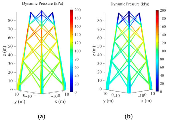 Under extreme wave conditions, the maximum computed dynamic pressures on the Cangnan and Lianjiang jacket foundations reach 181.58 kPa and 203.07 kPa, respectively. Under operating conditions, the corresponding values are significantly lower, at 70.17 kPa and 84.26 kPa. Figure 14 illustrates the temporal evolution of dynamic pressure distributions on the surface of the Cangnan jacket at typical moments under extreme wave conditions. The simulation results indicate that olaFlow effectively captures the transient wave loading process, demonstrating that the location of peak dynamic pressure gradually shifts from the front to the rear legs of the structure as the wave progresses through the structure.