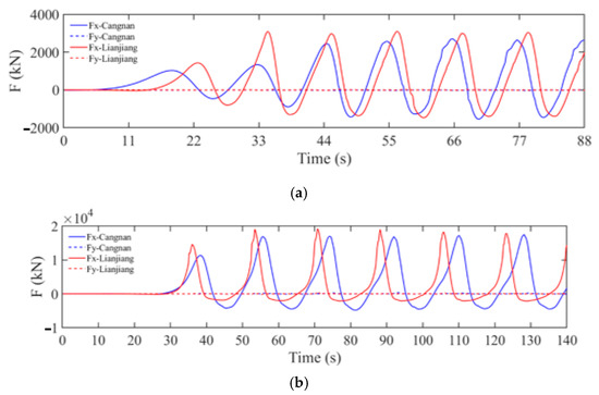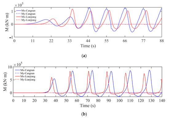 The time histories of horizontal forces and overturning moments acting on the Cangnan and Lianjiang jacket foundations under various wave conditions are derived from numerical simulations and presented in Figure 15 and Figure 16. Under extreme wave conditions, the peak horizontal forces in the incident wave direction (x-axis) are approximately 6.2 to 6.5 times greater than those observed under operating conditions. Similarly, the corresponding peak overturning moments exhibit increases of nearly sevenfold. In contrast, the horizontal forces and moments in the transverse direction (y-axis), perpendicular to wave propagation, are negligible relative to the x-direction components. The maximum horizontal force and moment values across all tested conditions are summarized in Table 8.