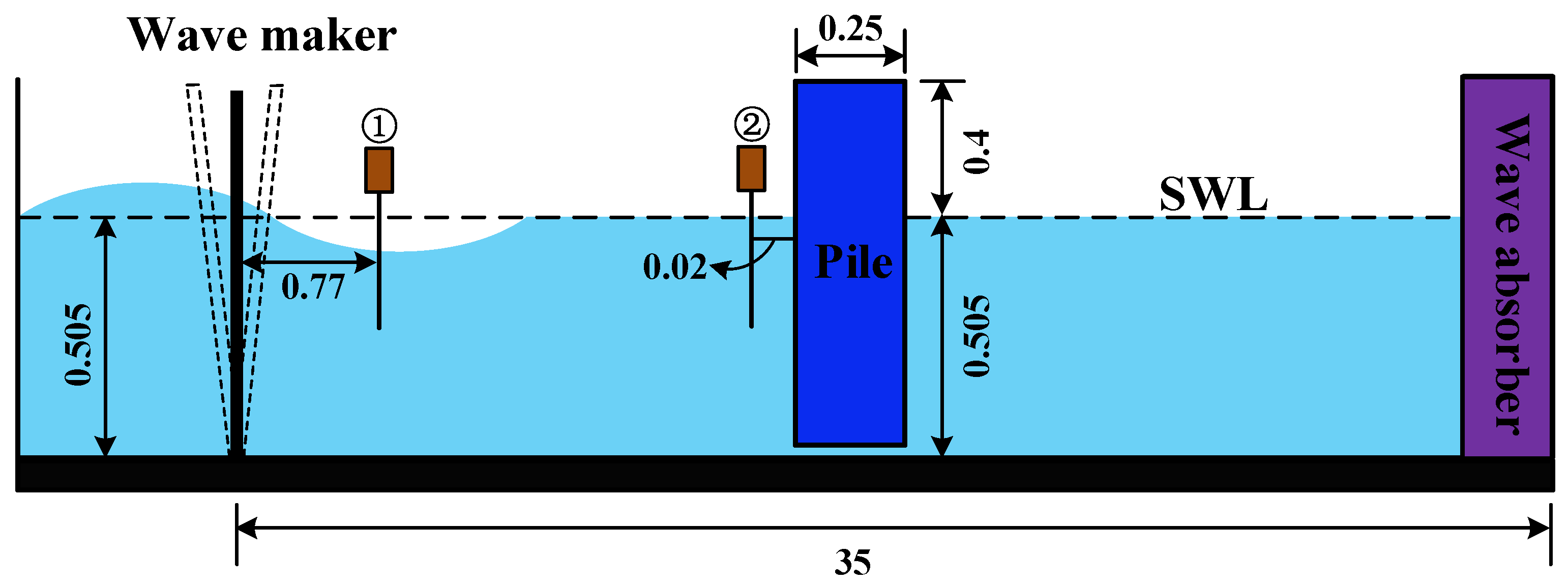 21] conducted experimental investigations on the interaction between regular waves and a monopile foundation under three operational cases in a flume with dimensions of 35 m length, 25 m width, and 1.8 m height. During the experiments, the water depth in the flume was maintained constant at 0.505 m. The cylinder extended vertically downward to the flume bottom, leaving a 1 mm gap beneath it. The cylinder was positioned 7.8 m from the wave generator. Pressure transducers were installed at four vertical locations along the stagnation point line upstream of the cylinder. An Acoustic Doppler Velocimeter (ADV) was utilized to measure wave kinematics, while an array wave gauge monitored the wave field surrounding the cylinder. Detailed parameter configurations are illustrated in