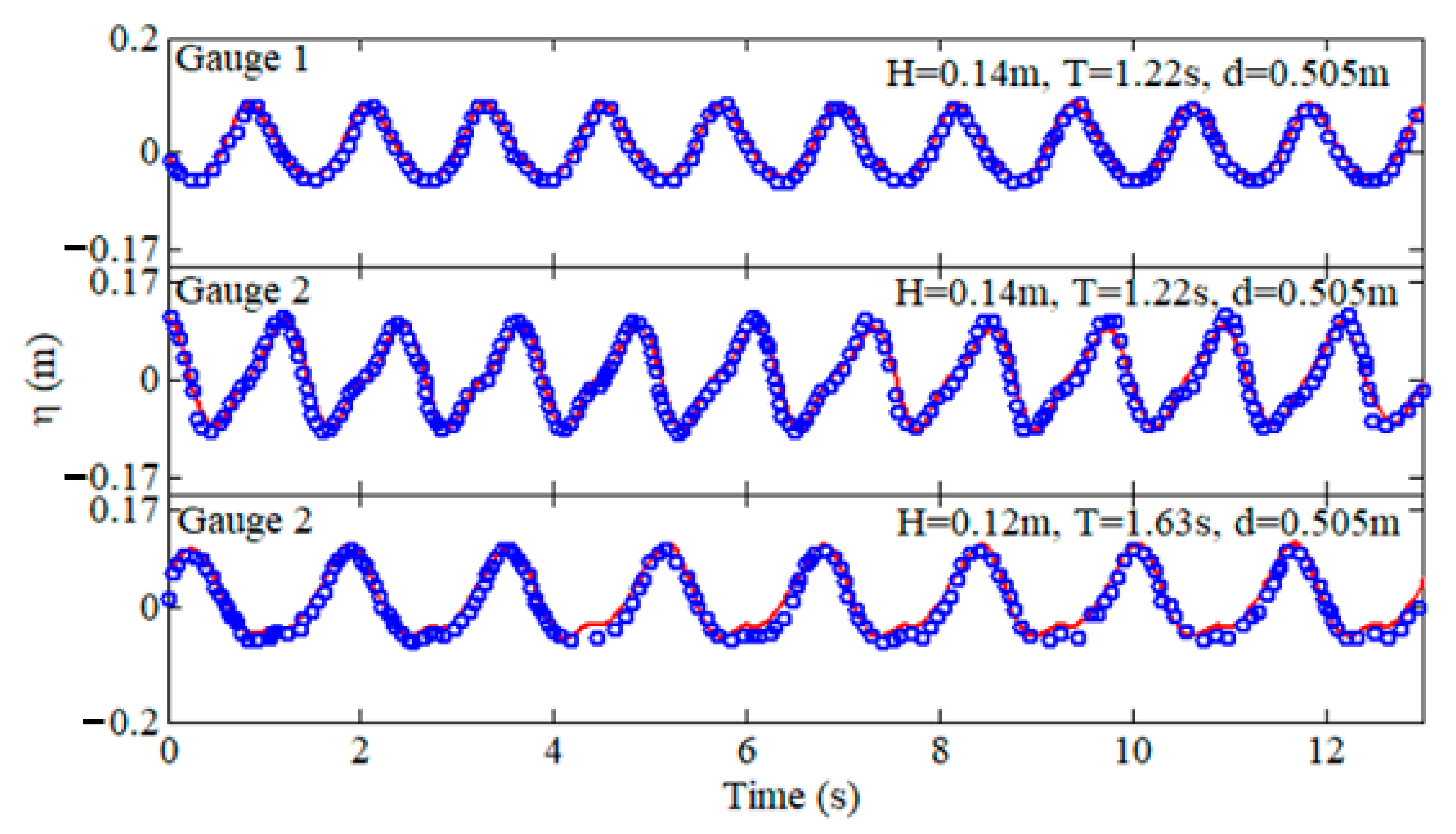 Figure 3 present time history comparisons of simulated wave heights and horizontal wave forces from OlaFlow against experiment data under different wave conditions. The simulated results show close agreement with experimental measurements, validating the solver’s capability for modeling wave-structure interactions.