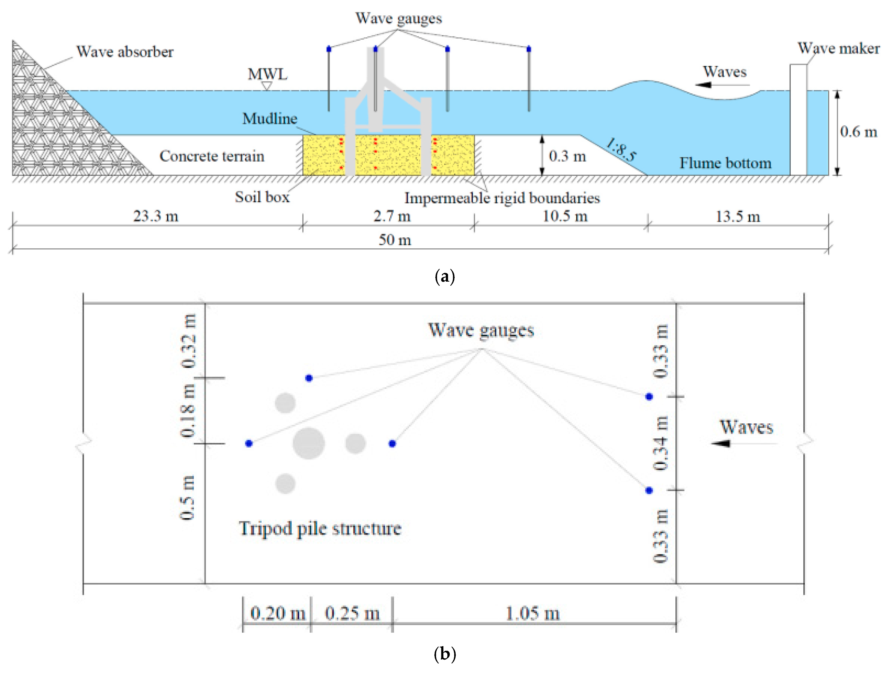 3] also conducted wave flume tests to investigate the dynamic response of seabed around tripod turbine foundations under dynamic wave pressure. It is found that the wave force acting on the tripod structure varies with different arrangements. Chatjigeorgiou et al. [