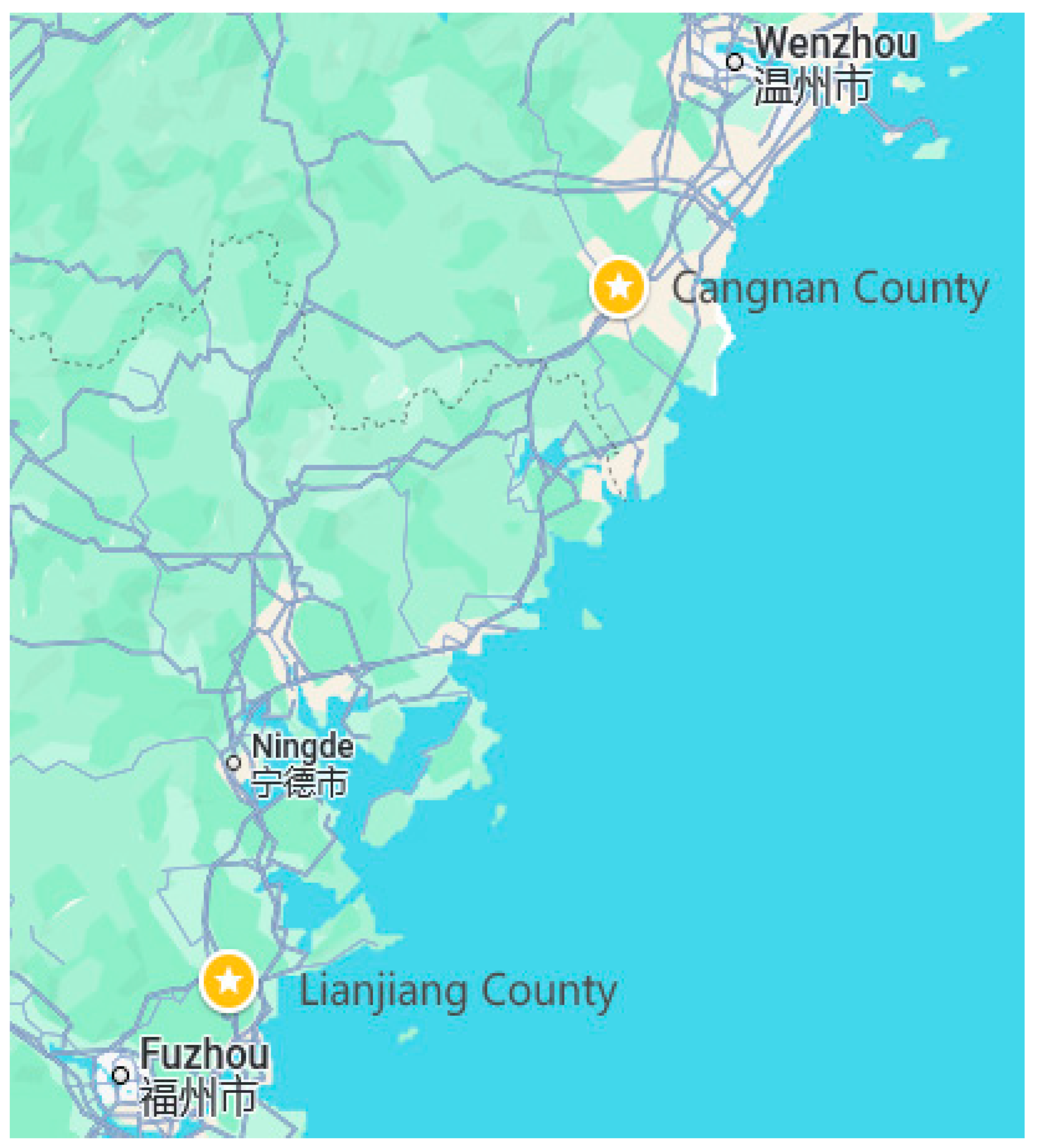 To advance offshore wind energy exploitation in southeastern China, deep-sea wind farm construction projects have been initiated in the adjacent waters of Cangnan County in Zhejiang Province and Lianjiang County in Fujian Province, China. The Locations of Cangnan County and Lianjiang County are shown in