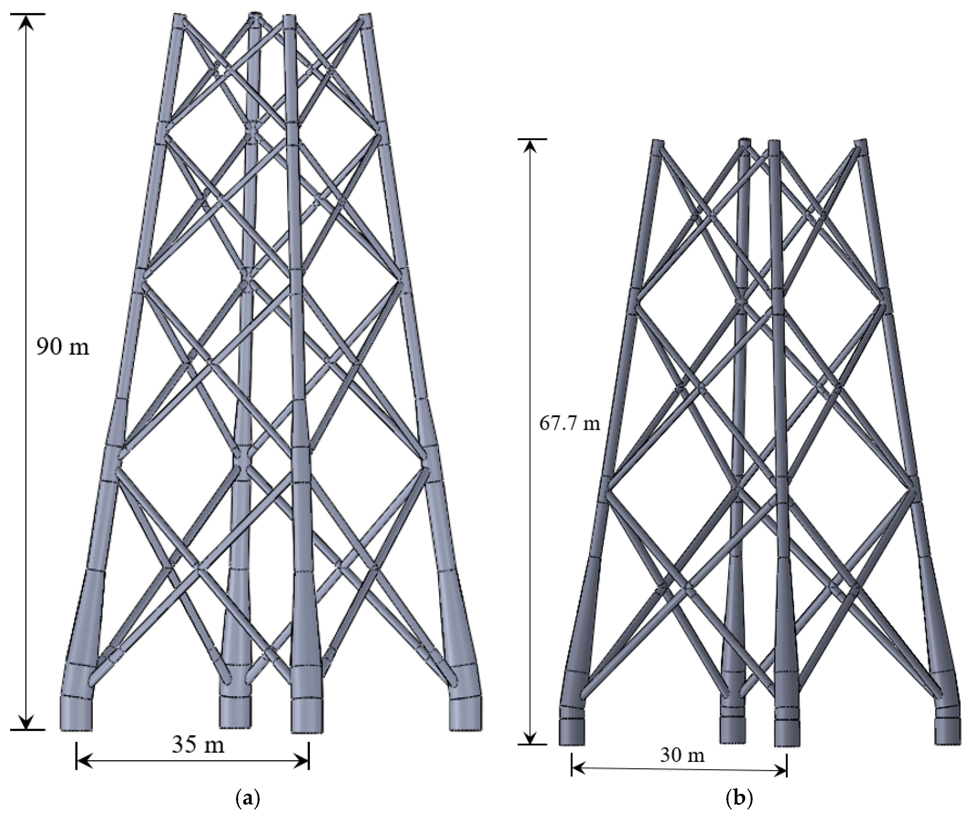 To ensure model accuracy and reliability, three-dimensional jacket models were constructed based on the actual geometric parameters of deep-water jackets from the Cangnan and Lianjiang offshore wind farms, as illustrated in