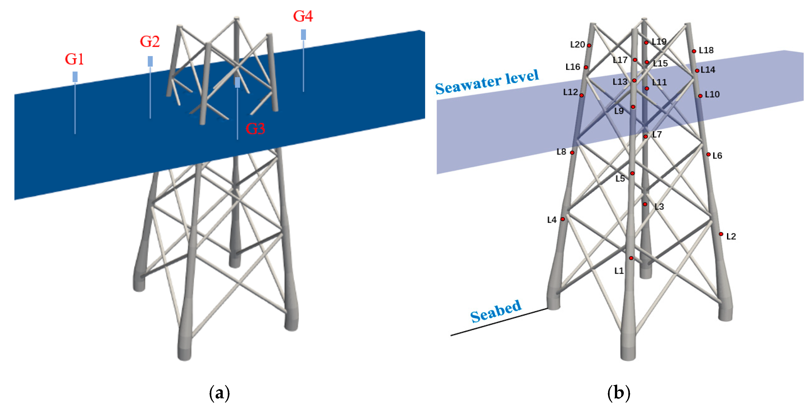 Figure 9a. Monitoring probes G1, G2, and G4 are positioned along the y-direction centerline, with G1 located at a greater distance from the jacket. Probe G3 is situated laterally adjacent to the jacket. Exact coordinates relative to the jacket center are provided in