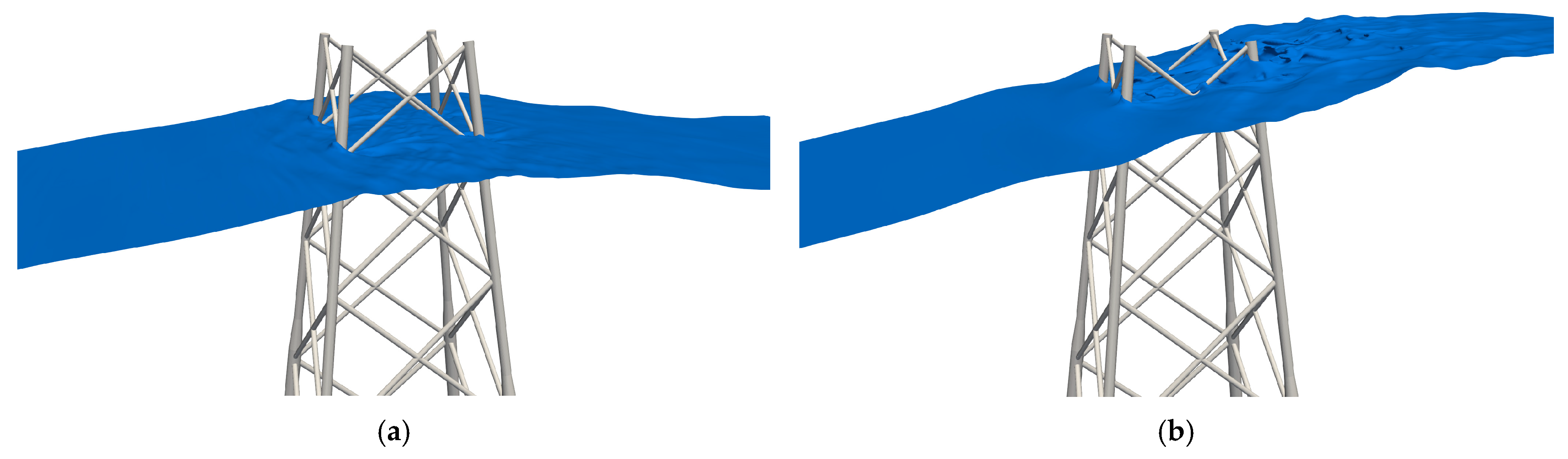 Representative wave run-up patterns on the Cangnan jacket under both operating and extreme wave conditions are illustrated in