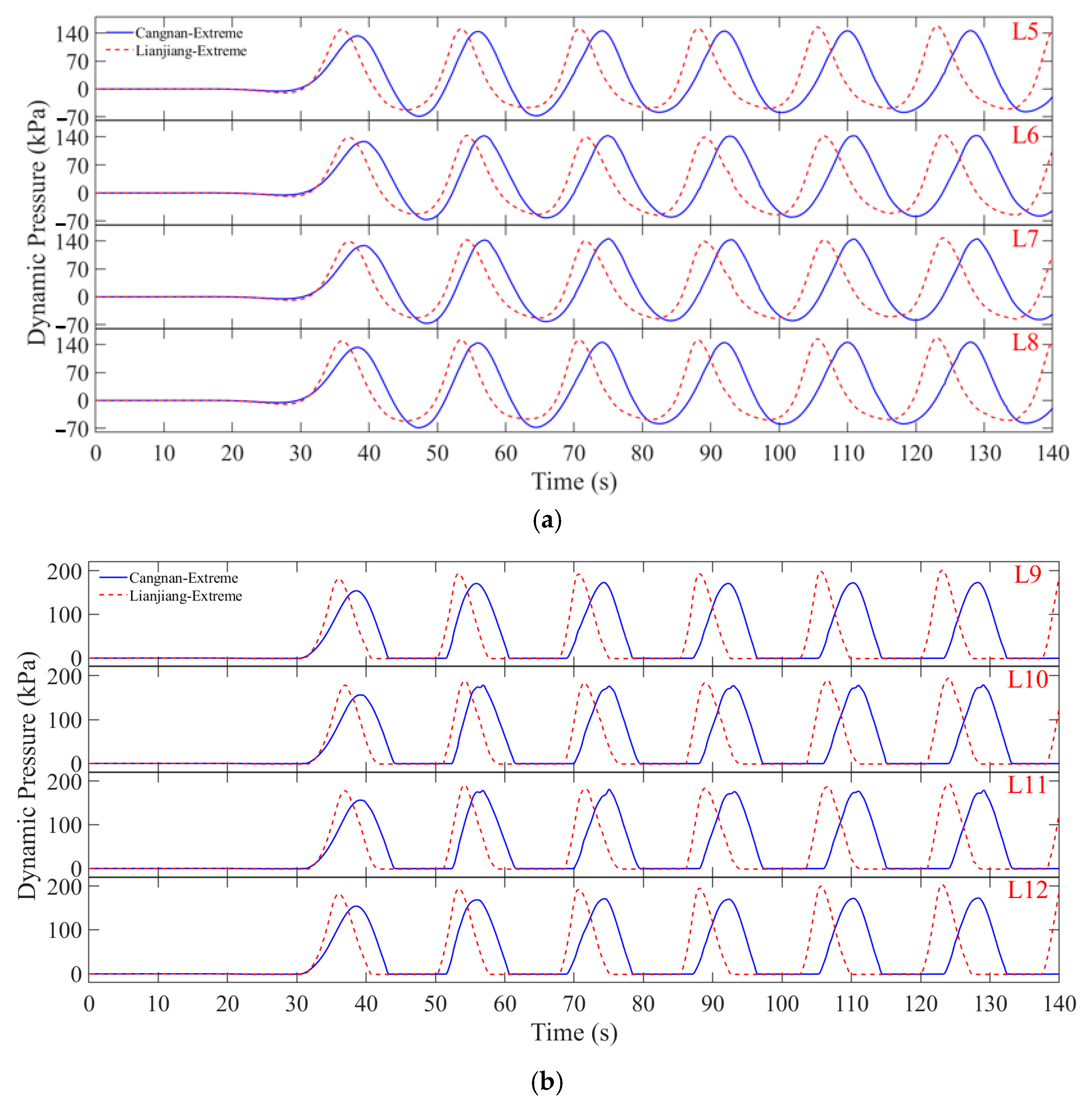 Table 7 summarizes the maximum dynamic pressures obtained at sensor group L9–L12 over representative wave cycles for various wave conditions.