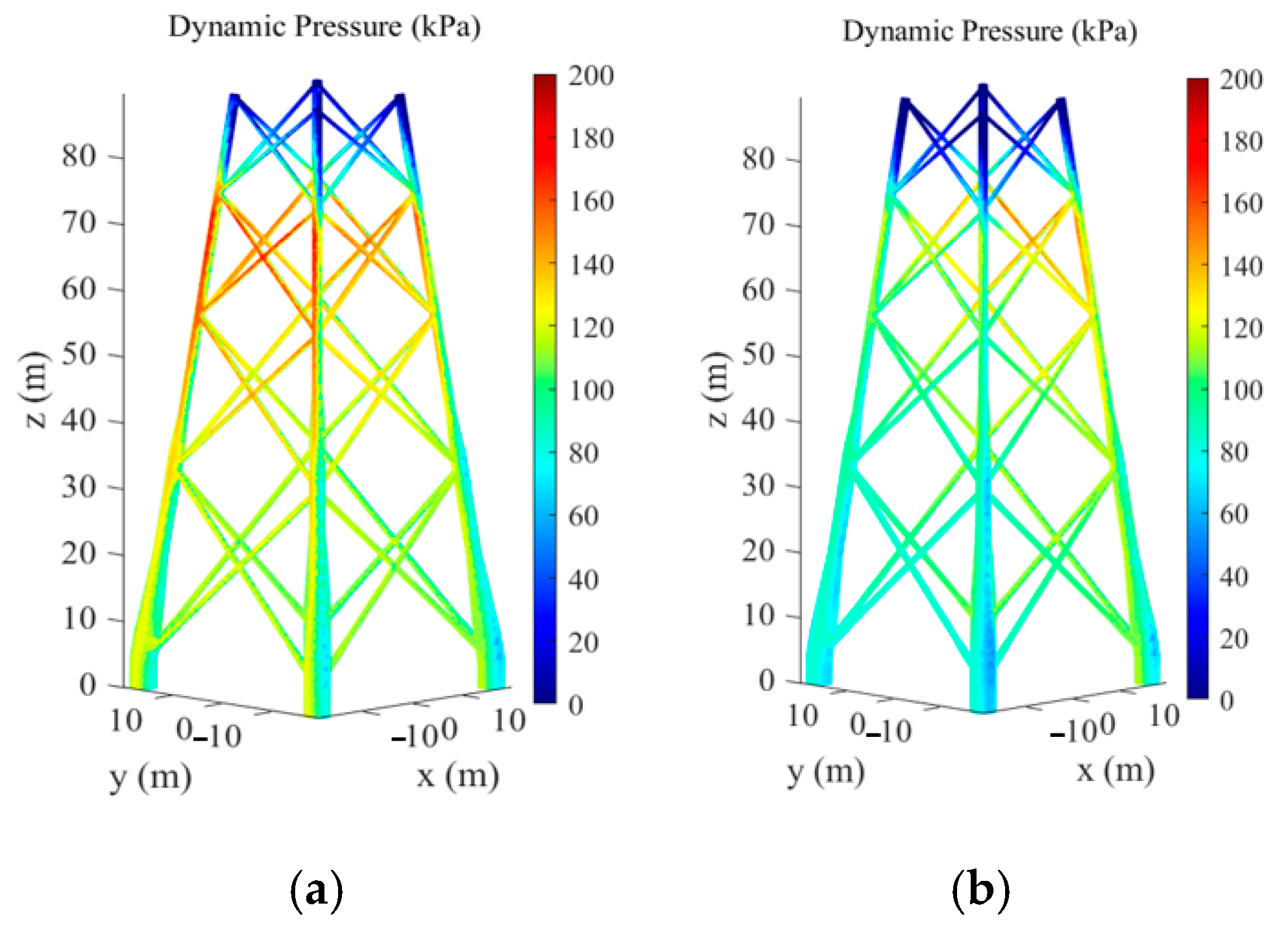 Figure 14 illustrates the temporal evolution of dynamic pressure distributions on the surface of the Cangnan jacket at typical moments under extreme wave conditions. The simulation results indicate that olaFlow effectively captures the transient wave loading process, demonstrating that the location of peak dynamic pressure gradually shifts from the front to the rear legs of the structure as the wave progresses through the structure.