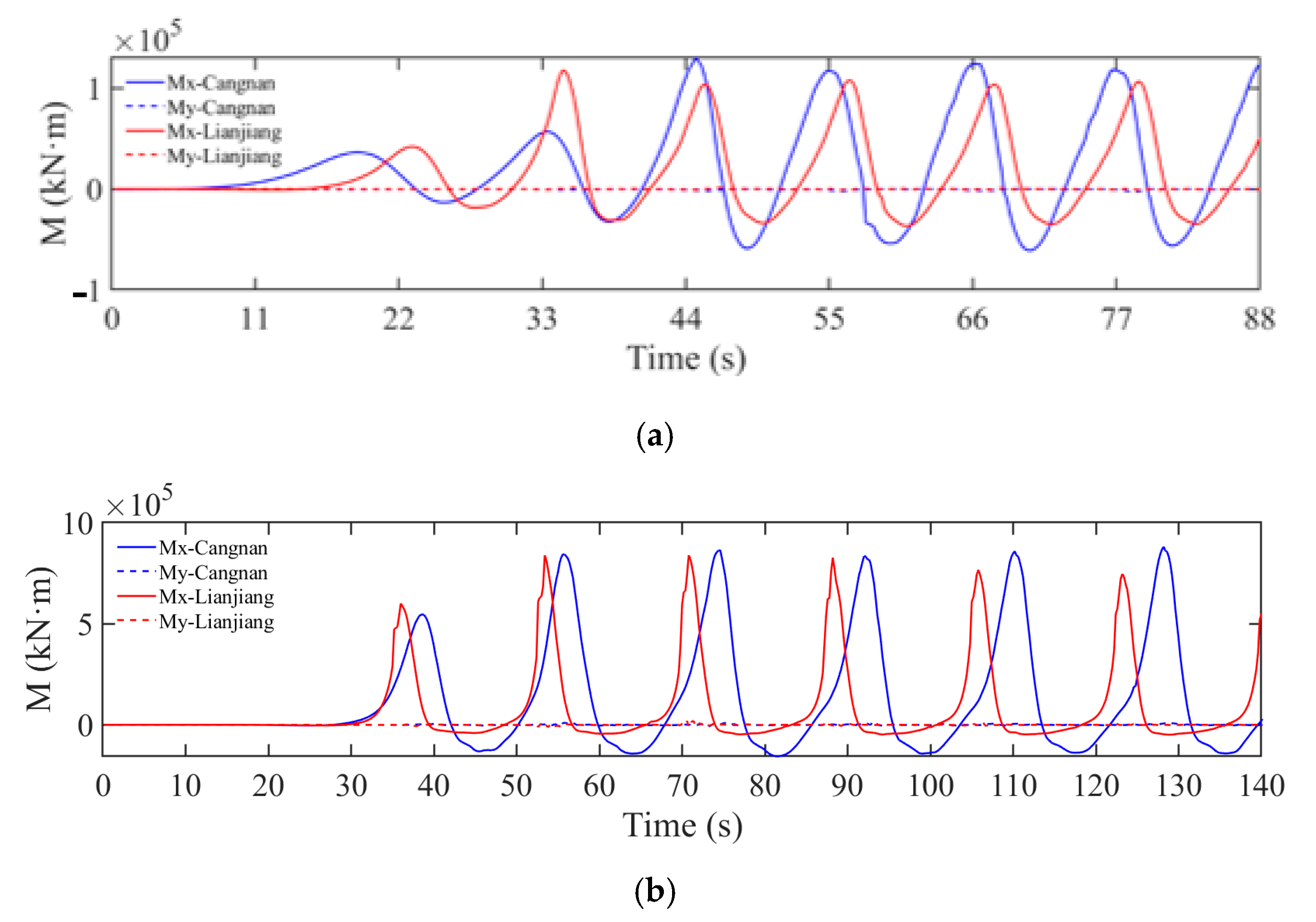 The time histories of horizontal forces and overturning moments acting on the Cangnan and Lianjiang jacket foundations under various wave conditions are derived from numerical simulations and presented in