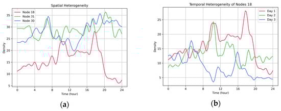 Firstly, VTF data exhibit significant spatiotemporal heterogeneity; that is, the VTF shows significant distributional differences across different waterway nodes, as well as fluctuating traffic patterns over different time periods at the same node. As shown in Figure 1a, significant differences are observed in the flow variation trends among multiple waterway nodes during the same time period. Each node exhibits high spatial heterogeneity in terms of peak and valley times, fluctuation amplitudes, and overall patterns of change. Figure 1b further illustrates the change process of a typical node across different time periods; it can be observed that the traffic flow pattern exhibits pronounced periodic fluctuations and asynchronous behavior, reflecting non-stationarity and dynamic variation in the temporal dimension. As a deep learning framework that can model the spatiotemporal heterogeneity of traffic flow, Spatio-Temporal Graph Neural Networks (STGNNs) have attracted widespread attention in recent years, and a large number of scholars have carried out relevant research in this field [7,8]. Nevertheless, most of STGNNs still rely on the static predefined graph structures, implicitly assuming that the spatial relationships between waterway nodes remain fixed through the prediction process. But the connection strength of each node in the traffic network is dynamically changing. This static assumption limits the model’s ability to model the spatial topological relationship in the traffic network, which also limits the prediction performance to a certain extent.