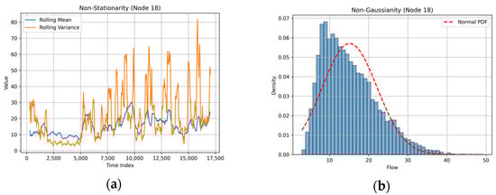 Secondly, VTF data exhibit both non-stationary and non-Gaussian characteristics. On the one hand, VTF data demonstrate a strong non-stationarity. As illustrated in Figure 2a, the sliding mean and standard deviation of the node continue to fluctuate in multiple time periods, indicating that its time series characteristics change significantly over time and show non-stationary characteristics. On the other hand, VTF data does not strictly follow the Gaussian distribution. As shown in Figure 1b, the probability density function of traffic flow is severely skewed and has a long tail, which indicates that the VTF data presents non-Gaussianity. Such non-stationary and non-Gaussianity challenge traditional modeling approaches, constraining the accuracy and robustness of long-term predictions. Although some researchers have employed sequence decomposition to generate more stable subsequences, these methods still fail to effectively address the underlying non-Gaussianity properties [9,10,11].