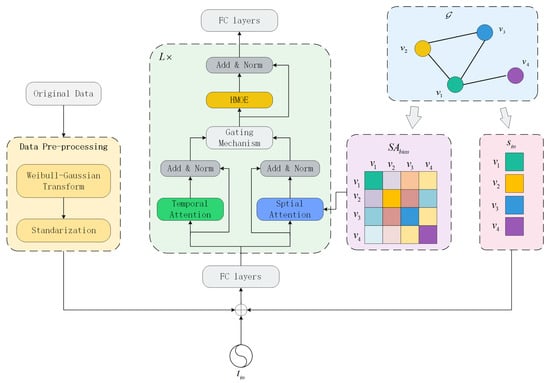 However, most existing STGNN models are built on the assumption of a static graph structure, which is evidently unrealistic. VTF exhibits pronounced spatiotemporal heterogeneity, and a static network structure prevents the model from capturing dynamic features, thereby limiting its predictive performance. Therefore, neural networks based on dynamic graph structures have emerged as a research hotspot. The Graph Attention Network (GAT) introduces an attention mechanism into graph structures, enabling the capture of dynamic changes in graph topology to a certain extent [37]. Such models have achieved notable success in the transportation domain [38,39,40]. For instance, Li et al. integrated GAT with extended causal convolution to capture traffic patterns that dynamically evolve across spatial and temporal dimensions [38]. Guo et al. proposed ASTGCN, in which the spatiotemporal attention mechanism effectively captures dynamic spatiotemporal correlations [39]. Although GAT introduces an attention mechanism into graph neural networks, allowing adaptive weighting of neighboring nodes and thereby enhancing the modeling of local spatial dynamic relationships, its attention is primarily confined to the spatial neighborhood within the graph structure, making it difficult to capture global temporal dependencies in long time series.