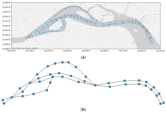 The location of Fujiangsha waterways and the corresponding waterway graph structure. (a) shows the water division in the study area and the geographical location of each node. (b) shows the graph structure network constructed based on the waterway division, where the nodes represent the segments and the edges represent the connectivity between the segments, which is used to model the flow characteristics of ships in the waterway system.