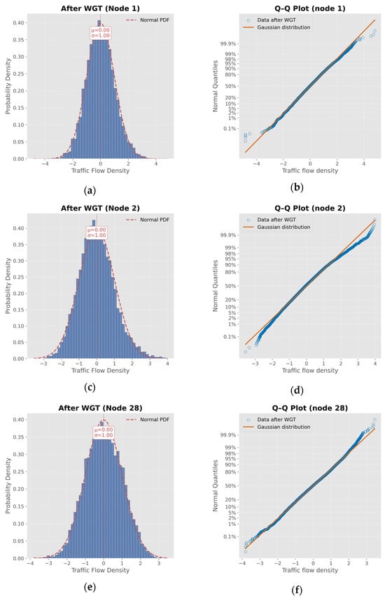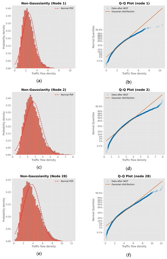 Figure 5 shows the distribution statistics of the vessel traffic density data at the selected nodes using probability density functions and Q-Q plots, respectively. It can be seen from the figure that the traffic density data at these nodes deviate significantly from the Gaussian distribution. Specifically, the histograms show varying degrees of skewness and long-tail behavior, indicating that they have non-Gaussianity. The corresponding Q-Q plots further confirm this observation, with the empirical quantiles deviating from the theoretical Gaussian line, especially at the tail of the distribution. These results highlight the complexity and heterogeneity of ship traffic patterns, and the need to deal with such complex traffic patterns in order to obtain more accurate traffic flow prediction results.